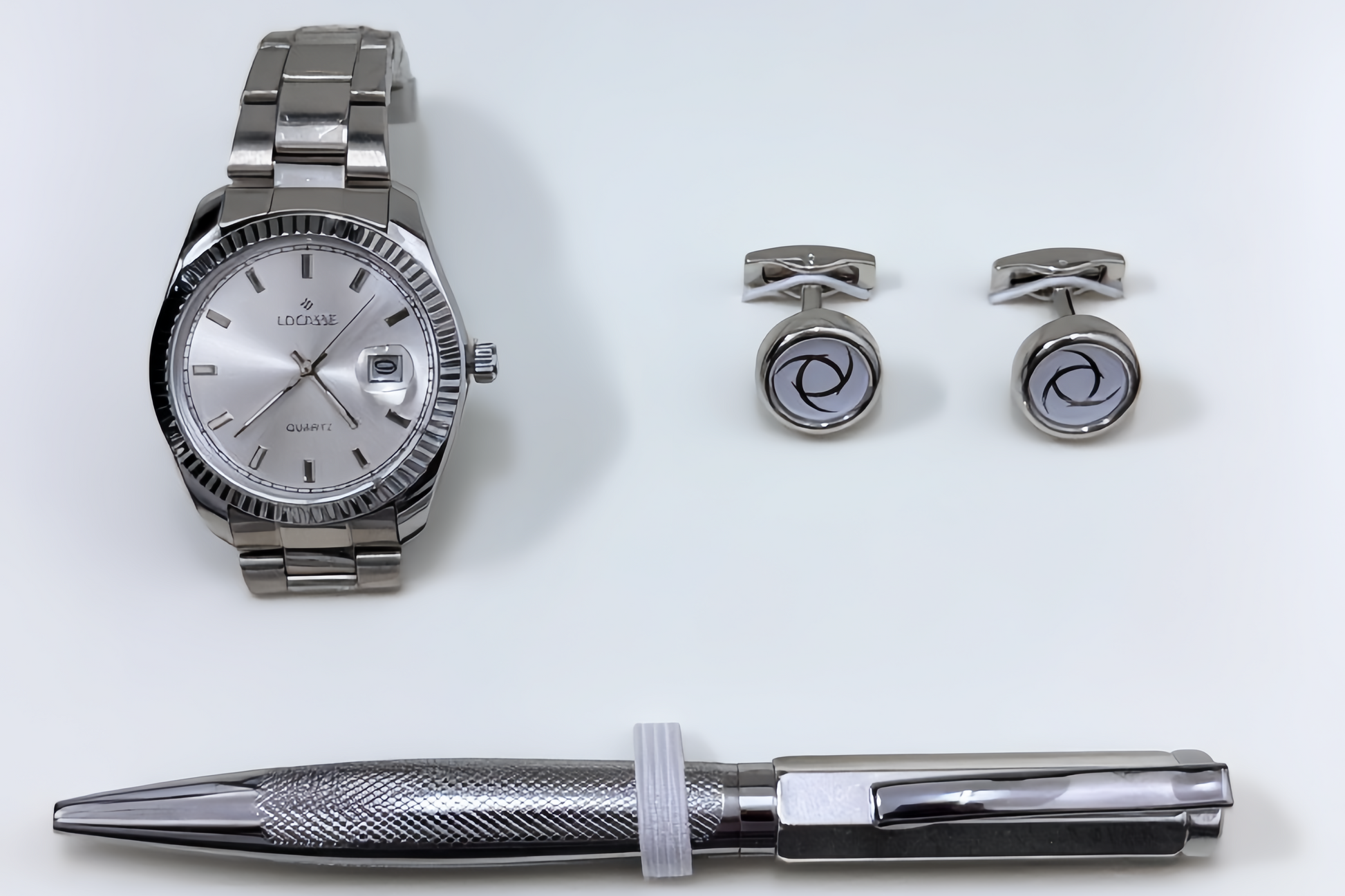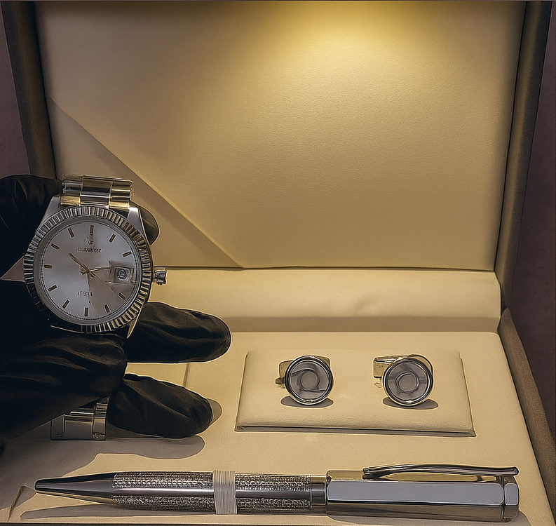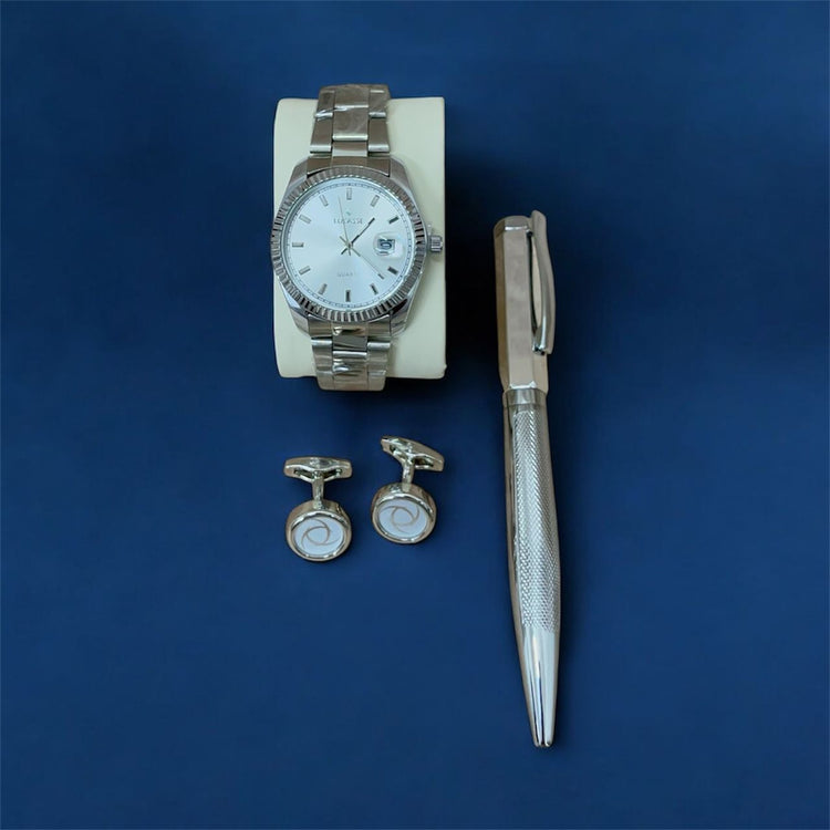 طقم إكسسوارات رجالي فاخر يجمع بين ساعة معدنية أنيقة وقلم معدني راقٍ وأزرار أكمام كلاسيكية، تصميم يعكس الفخامة والذوق الرفيع ويضفي لمسة من التميز على إطلالتك في جميع المناسبات
