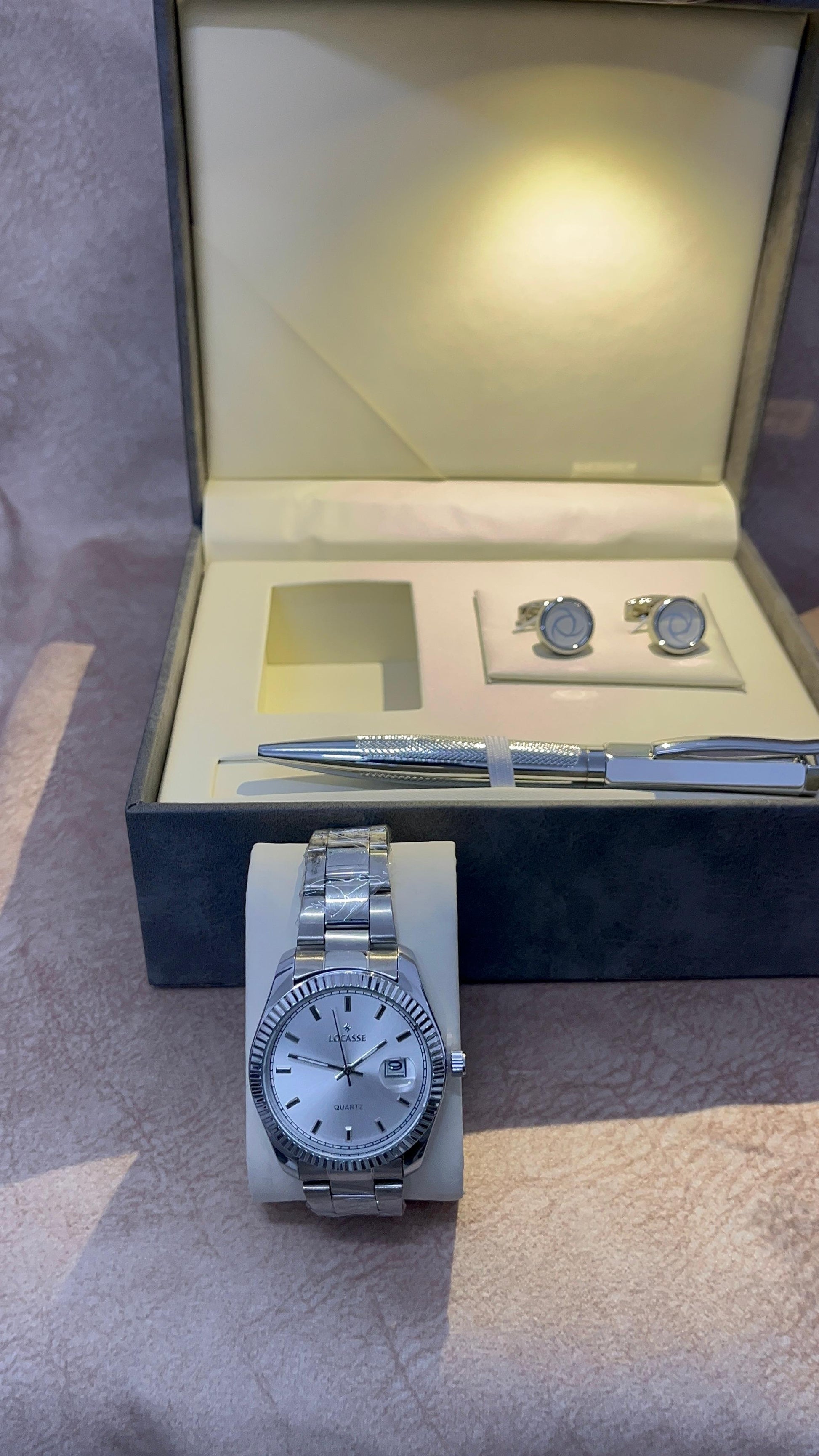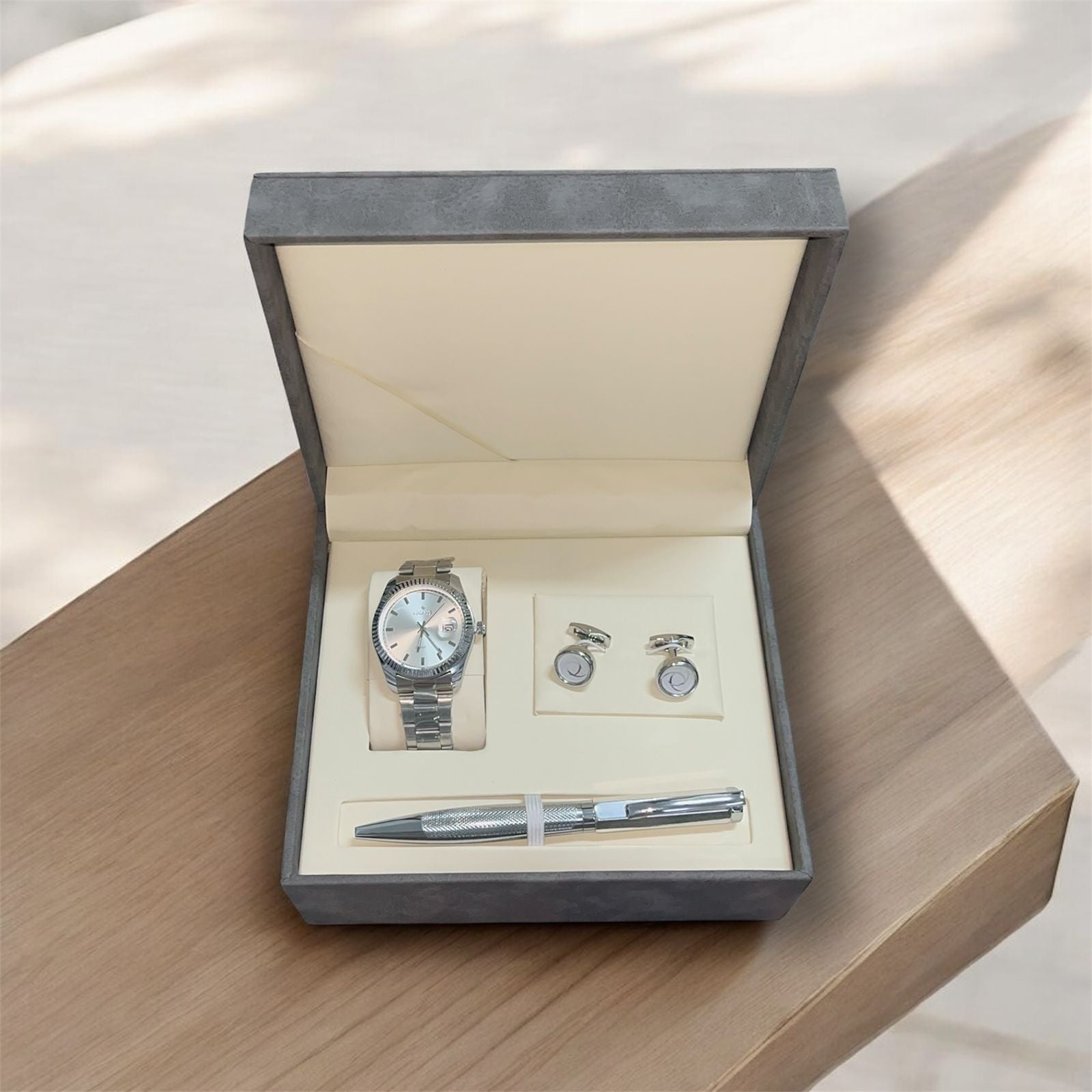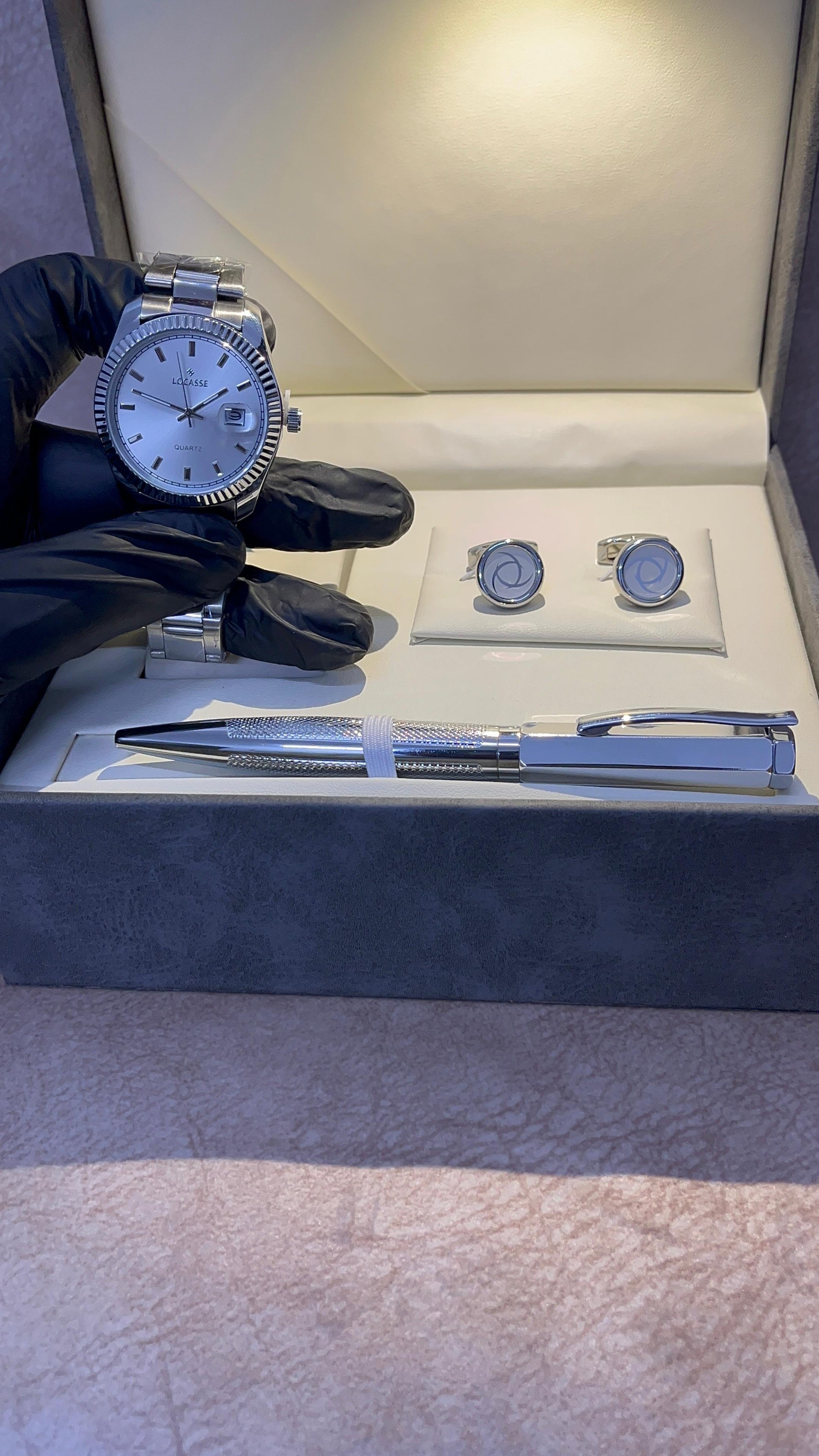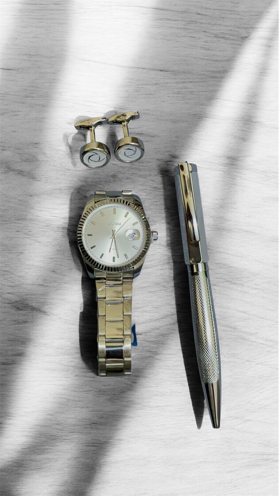 طقم إكسسوارات رجالي فاخر يجمع بين ساعة معدنية أنيقة وقلم معدني راقٍ وأزرار أكمام كلاسيكية، تصميم يعكس الفخامة والذوق الرفيع ويضفي لمسة من التميز على إطلالتك في جميع المناسبات