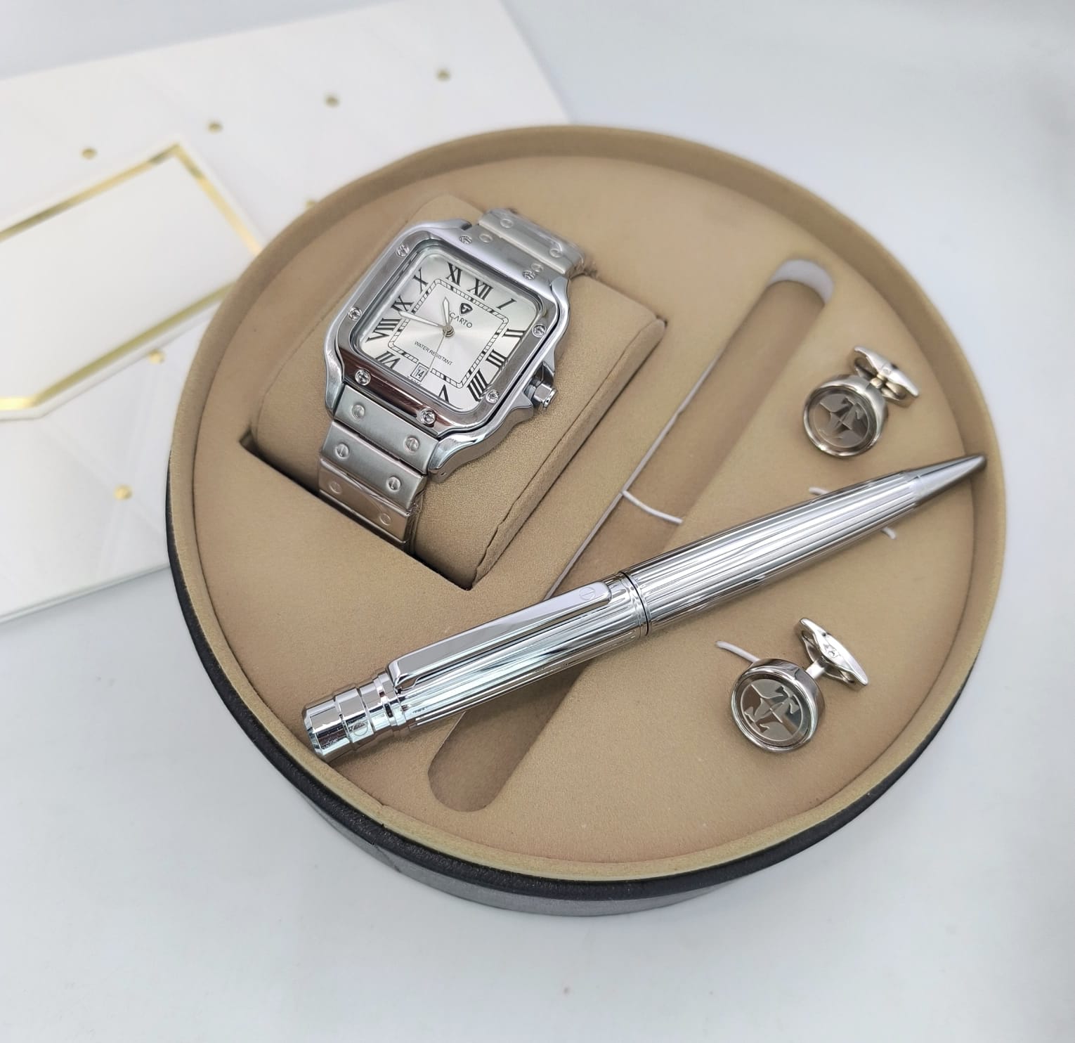 ساعة معدنية بلمسات ذهبية مع إكسسوارات متكاملة تمنحك مظهراً راقياً في جميع الأوقات.