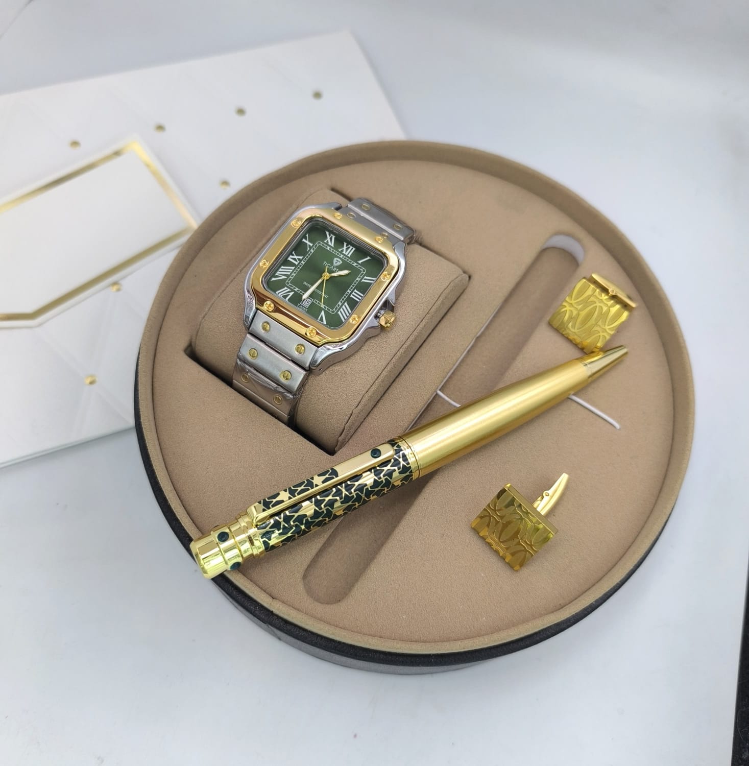 ساعة معدنية أنيقة مع كبك وقلم بتفاصيل دقيقة تمنحك حضوراً قوياً أينما كنت.