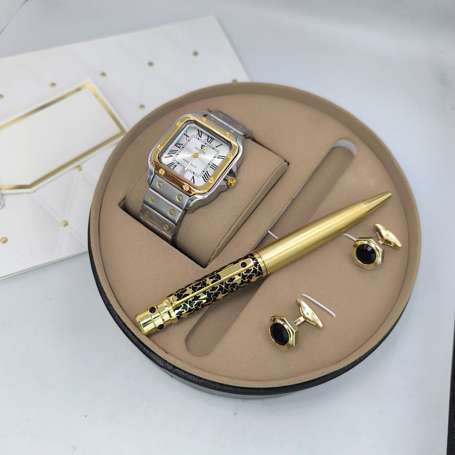 تصميم عصري يجمع ساعة معدنية لامعة مع قلم فاخر وسبحة بألوان متناسقة.