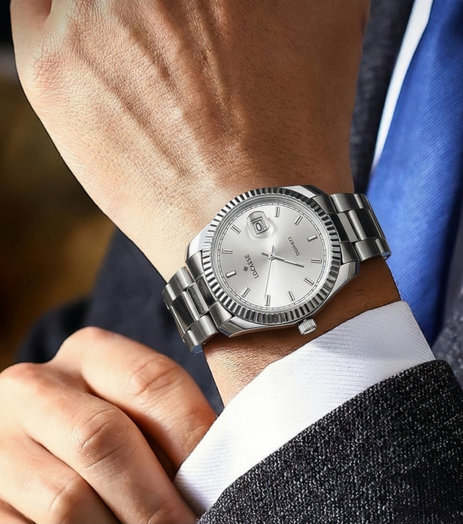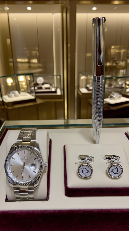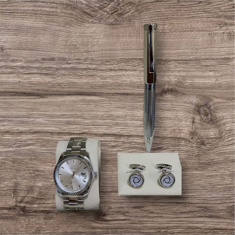 طقم إكسسوارات رجالي فاخر يجمع بين ساعة معدنية أنيقة وقلم معدني راقٍ وأزرار أكمام كلاسيكية، تصميم يعكس الفخامة والذوق الرفيع ويضفي لمسة من التميز على إطلالتك في جميع المناسبات